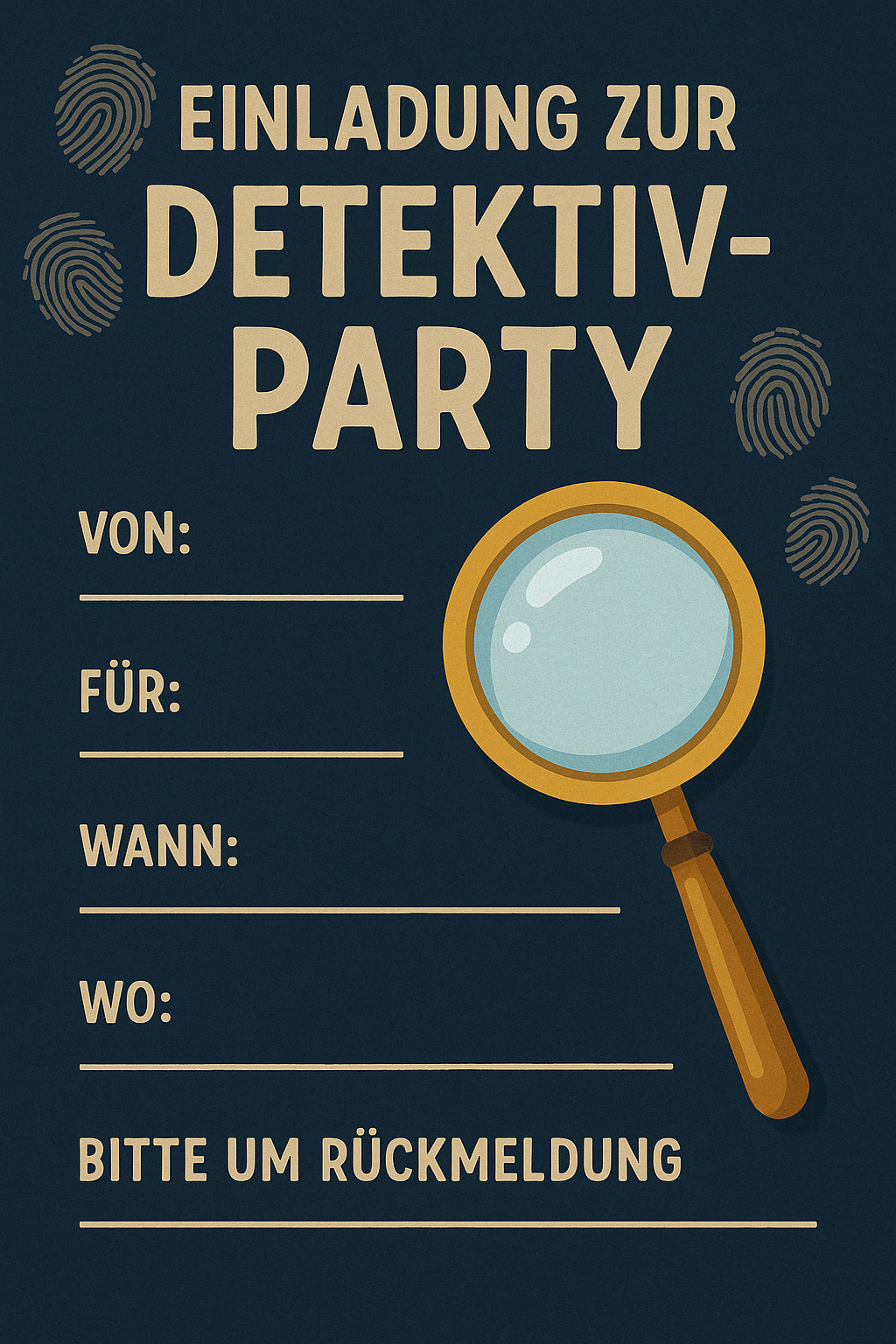 Die wiedergefundene Geburtstagstorte (echte Torte!) mit versteckten Süßigkeiten, Detektiv-Ausweise, Lupen, kleine Notizbücher und Detektiv-Sticker für jedes Kind.