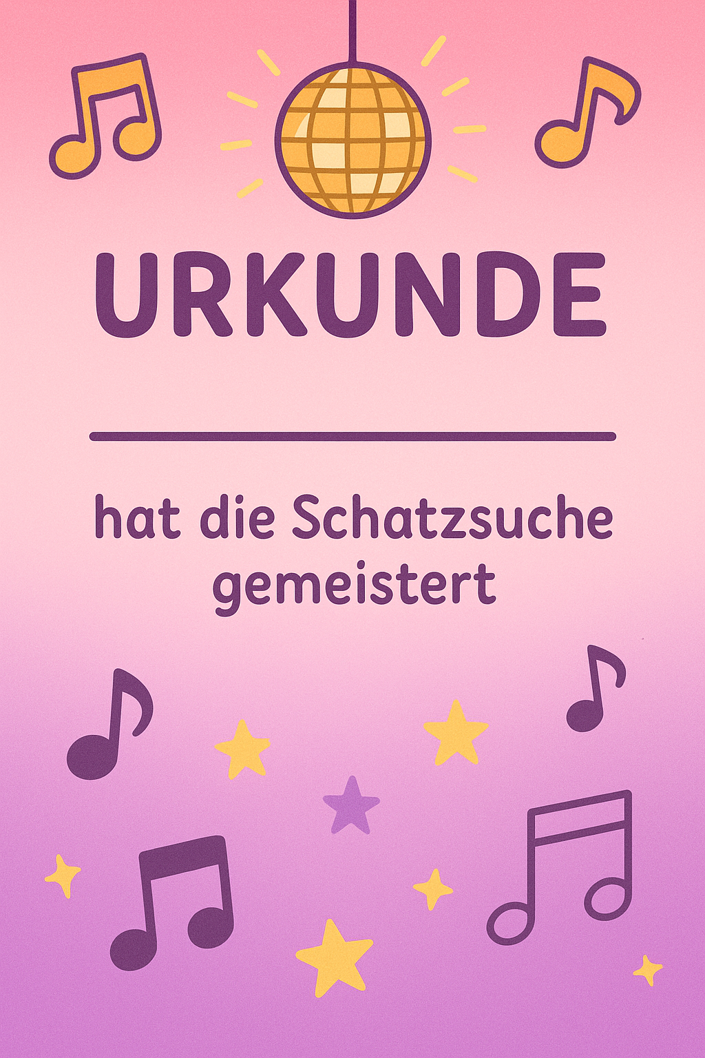Eine glamouröse Schatzkiste mit: einem goldenen Spielzeug-Mikrofon für das Geburtstagskind, Sieger-Urkunden für alle Tänzer, Tanzsticker und Tattoos, Glitzer-Haarreifen, kleinen Disco-Lichtern und Süßigkeiten.
